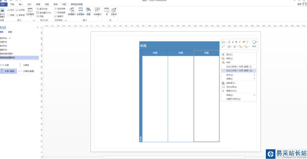 4、點泳道,右鍵選擇“在此之前/之后插入泳道”,可插入泳道,如圖