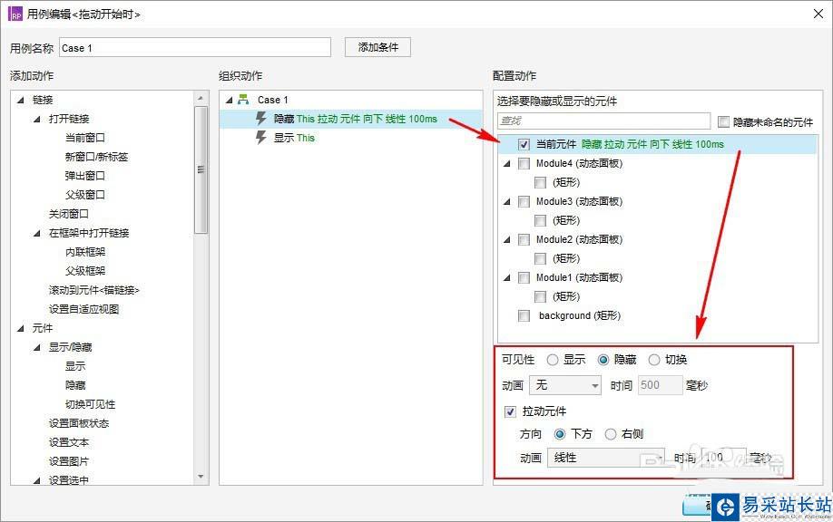 (隱藏”動態面板:組件1“時的拉動元件,可以不設置動畫,設置動畫及時間是為了有個“移動”的感覺,副作用就是相應的操作不能過快)