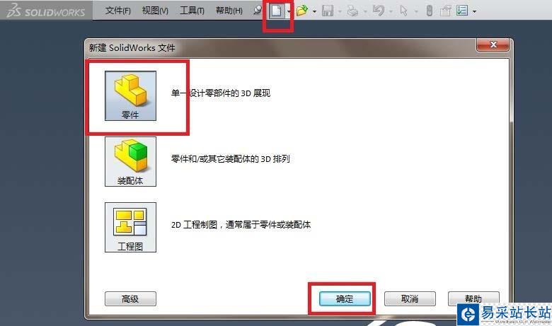 1、如下圖所示,打開SolidWorks軟件,點擊工具欄中的“新建”圖標,在彈出的“新建SolidWorks文件”對話框中先選中“零件”,然后點擊其下方的“確定”,完成一個空白“零件”文件的新建。