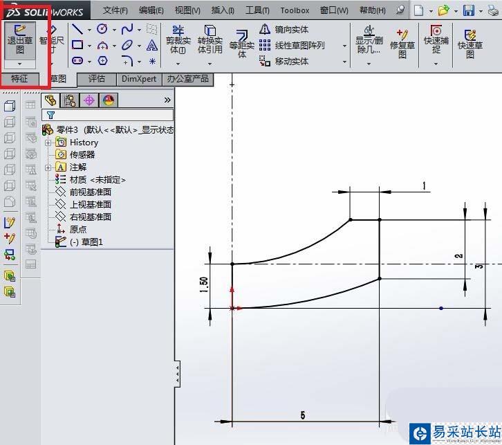 3、如下圖所示,進入到草圖環境。首先點擊工具欄中的“中心線”圖標,然后在草圖工作區域畫三條中心線(見下圖),然后點擊工具欄中的“直線”圖標,然后在草圖工作區域畫三條直線段(見下圖),然后點擊工具欄中的“智能尺寸”,按照下圖尺寸標注直線段的尺寸,將其定形、定位,然后點擊工具欄中的“圓弧”圖標,然后按照下圖畫兩個圓弧,然后“添加幾何關系”,圓弧與橫向中心線相切,然后“退出草圖”。