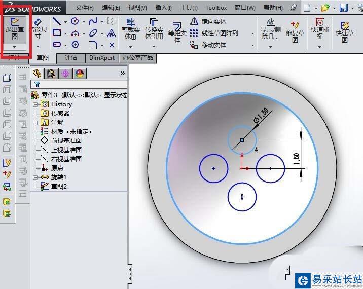 6、如下圖所示,畫草圖。具體:點擊工具欄中的“圓”圖標,在草圖工作區域畫一個圓,點擊工具欄中的“智能尺寸”,標注圓的定形尺寸和定位尺寸,將其完全約束,點擊工具欄中的“圓周草圖陣列”圖標,將圓陣列成四個,完成草圖繪制之后,“退出草圖”。
