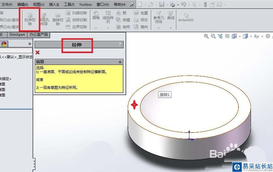 5、如下圖所示,點擊工具欄中的“拉伸切除”圖標,然后在彈出“拉伸”對話框之后,選擇紅色四角星所在的平面為草圖平面,然后,軟件就自動進入到草圖環境。