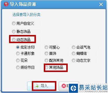 彈出窗口,點擊動態飾品——其他飾品——導入,如圖,