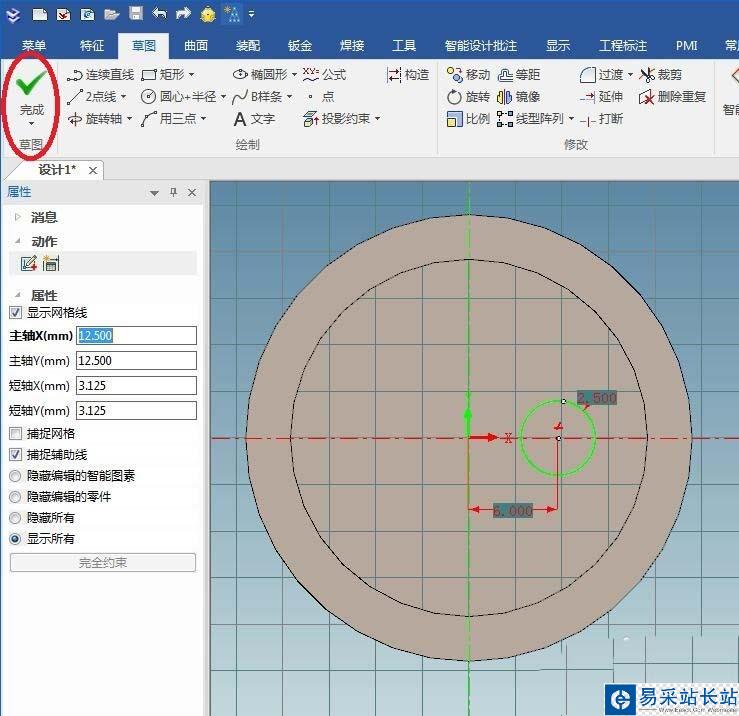 9、如下圖所示,進入到草圖環境,在X軸上畫一個小圓,然后標注尺寸,最后“完成”。
