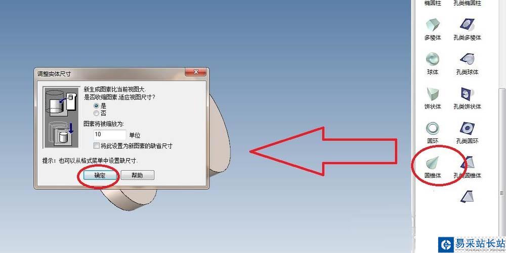 6、如下圖所示,為了節省時間,我們直接從設計元素庫中拖一個圓錐體過來,記住,放置的位置是面的中點,然后軟件會有下圖中的提示:調整實體尺寸對話框,我們只管點擊“確定”就可以了。