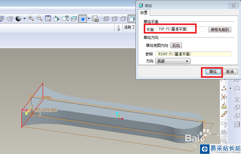 5、如下圖所示,執(zhí)行【拉伸——放置——定義——TOP面——草繪】。