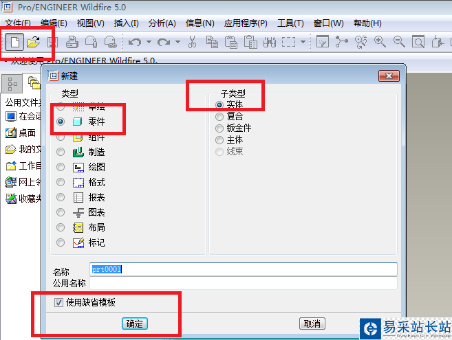 1、如下圖所示,打開Pro/e5.0軟件,新建一個(gè)實(shí)體零件文件,為了節(jié)省時(shí)間,我們“使用缺省模板”。