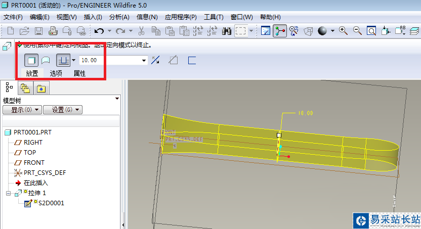 4、如下圖所示,完成并退出草繪之后,來到拉伸界面,軟件左上角設(shè)置拉伸高度10,軟件右上角打“√”完成。