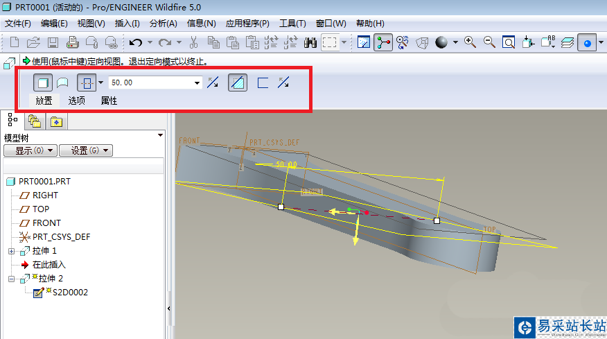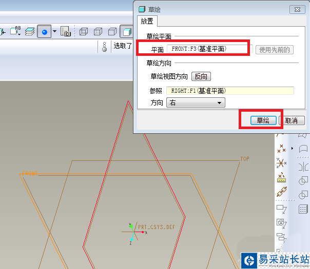 2、如下圖所示,執(zhí)行【拉伸——放置——定義——FRONT面——草繪】。