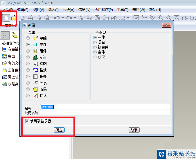 1、如下圖所示,打開Pro/e5.0軟件,“使用缺省模板”新建一個實體零件文件。