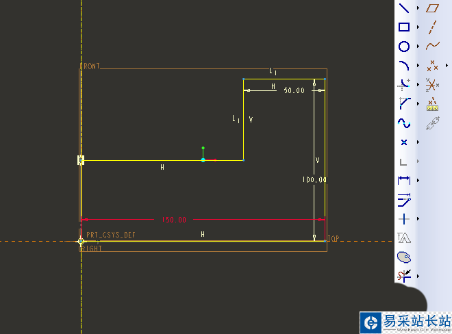 2)點擊右邊工具箱中的“直線”圖標,在草繪區域畫出旋轉截面圖形,