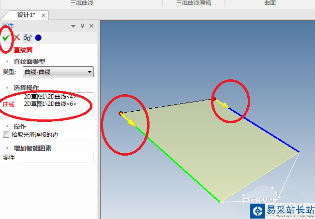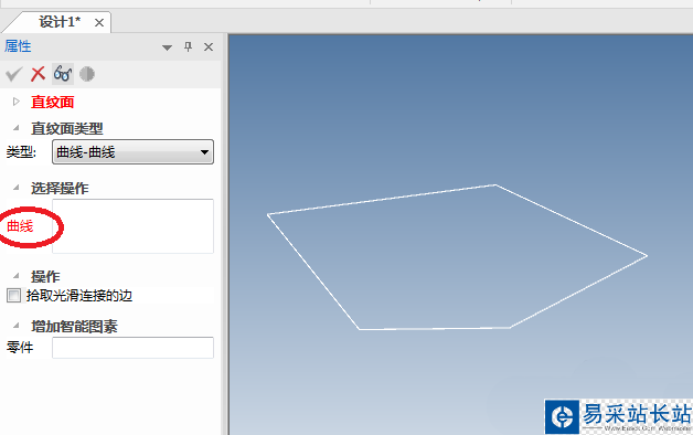 5、如下圖所示,軟件左邊屬性欄出現(xiàn)了“直紋面”,注意紅色框選中的紅色文字“曲線”,這是要我們選擇草圖中的曲線。