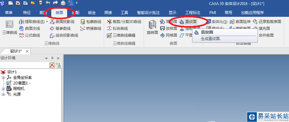 4、如下圖所示,點(diǎn)擊標(biāo)題欄中的“曲面”,點(diǎn)擊工具欄中的“直紋面”圖標(biāo),激活該命令。