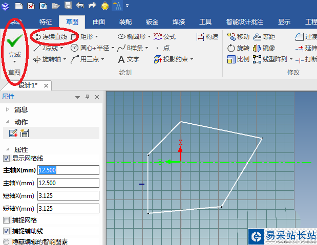 3、如下圖所示,進(jìn)入到草繪環(huán)境,首先點(diǎn)擊工具欄中的“連續(xù)直線”圖標(biāo),激活該命令,然后在草圖工作區(qū)域隨便畫一個(gè)封閉的不規(guī)則多邊形,最后點(diǎn)擊“完成”。