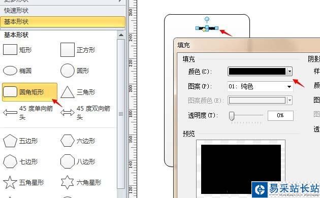 2、接著,繼續從左側形狀欄中拖入一個“圓角矩形”,調整其大小和形狀,并將其填充顏色設置為純黑色,如圖所示。