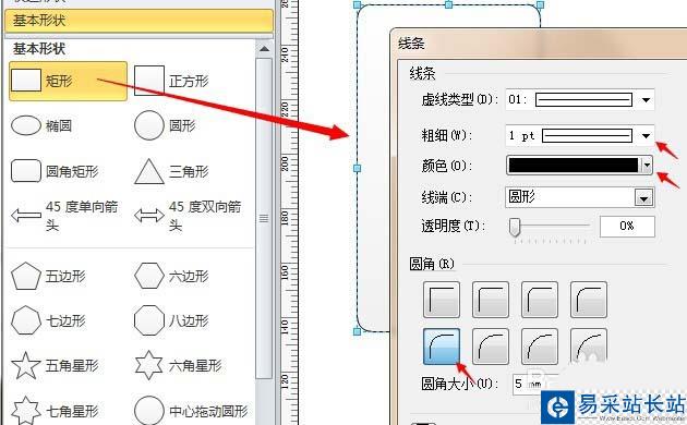 1、首先,從左側形狀欄中拖入一個“矩形”,并將其線條設置為純黑色,較粗一些,且四個角設置為圓角,如圖所示。