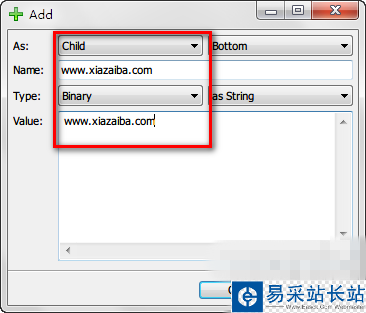 4:在窗口里選擇 AS: 下拉框里選擇Child (很重要,編輯錯誤會導(dǎo)致種子損壞,請先備份) Name 和Value 隨便了