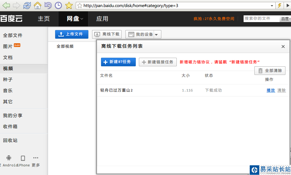 6:百度盤的離線里添加BT種子,離線好,可以播放了哦,哈哈,真爽!