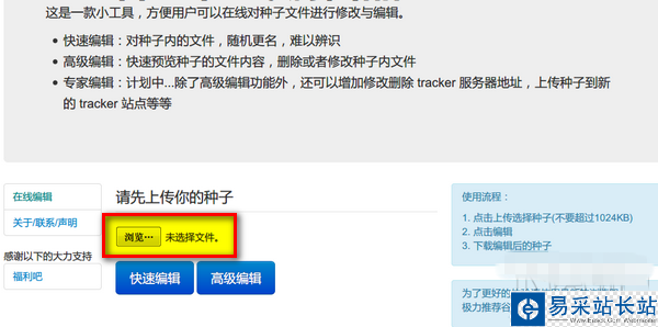 打開網(wǎng)站:http://bteditor.sinaapp.com 這個是一個簡約的清洗你的BT種子的網(wǎng)站,擁有 快速編輯 和 高級編輯 功能,一般就能解決大部分的問題,處理后的文件就能離線了,就是文件名是隨機的,成功率還是挺不錯的。