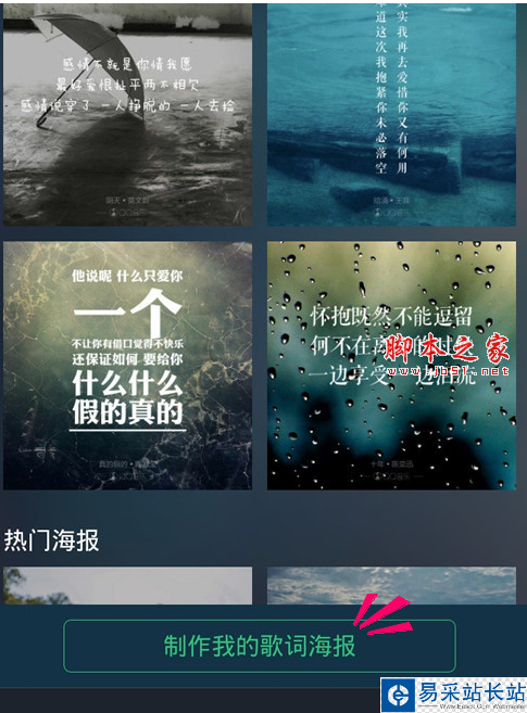 3、點擊進入后你可以看到系統推薦的幾款熱門海報樣式,你也可以點擊[制作我的歌詞海報]從零開始創作海報。
