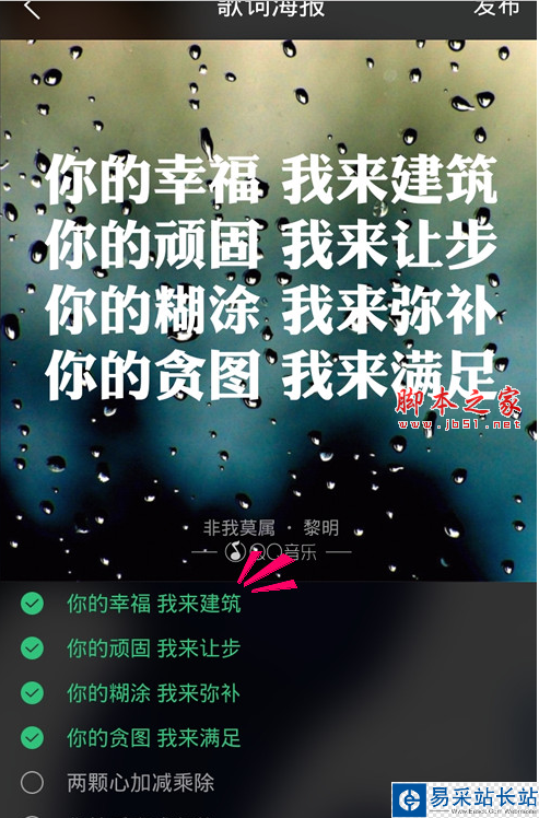 6、歌詞海報的主角當然是歌詞了,所以當你選擇一首歌曲之后,重點是選擇歌詞,被你選擇的歌詞會顯示到海報的中間,當然歌詞可以選擇一句也可以是多句。