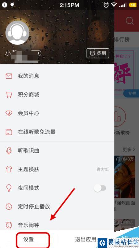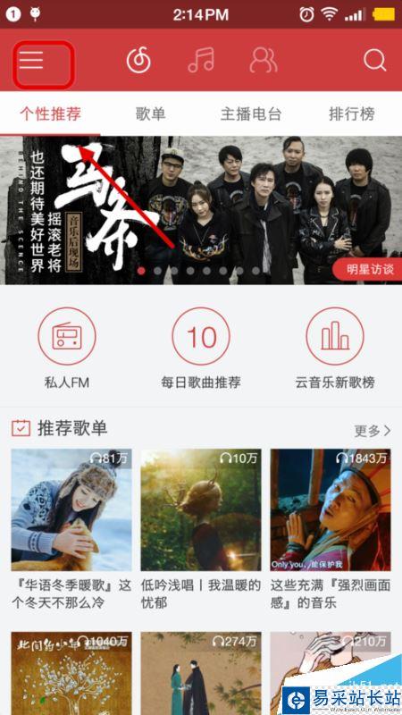 打開網易云音樂APP首頁,點擊左側菜單按鈕