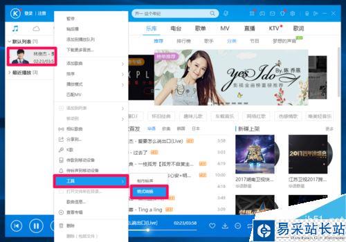 右鍵點擊默認列表中的歌曲,在右鍵菜單中點擊【工具】-【格式轉(zhuǎn)換】;