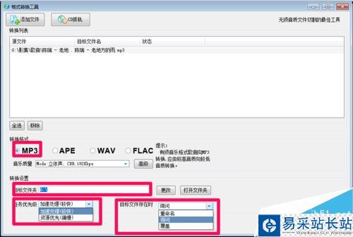 此時需要轉(zhuǎn)換的歌曲便顯示在格式轉(zhuǎn)換工具窗口的轉(zhuǎn)換列表中。點擊:轉(zhuǎn)換格式【MP3】,確定目標文件夾,【任務優(yōu)先級】我們可以選擇:加速處理或資源優(yōu)先,【目標文件存在時】可以選擇:重命名、詢問或覆蓋,最后點擊:轉(zhuǎn)換文件;