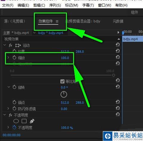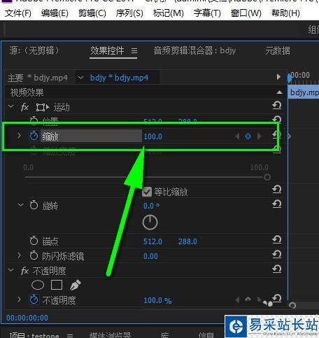 3、之后到“效果控件”——“運動”——“縮放”便可以看到100%(即畫面滿滿)。