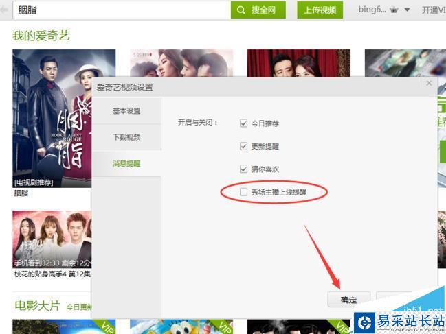 6、在消息提醒選項的右側窗口中,將“開啟與關閉”下的“秀場主播上線提醒”選項取消勾選,再點擊“確定”按鈕。如圖所示;