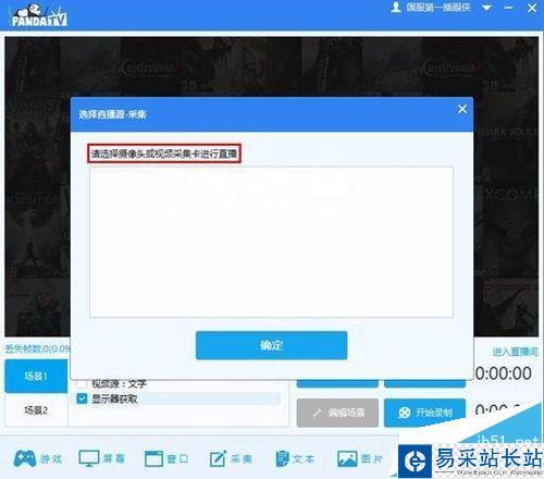 點擊“采集”,助手會提示添加直播源,直播源可以是攝像頭或者視頻采集卡,主播可以自行選擇進行直播。
