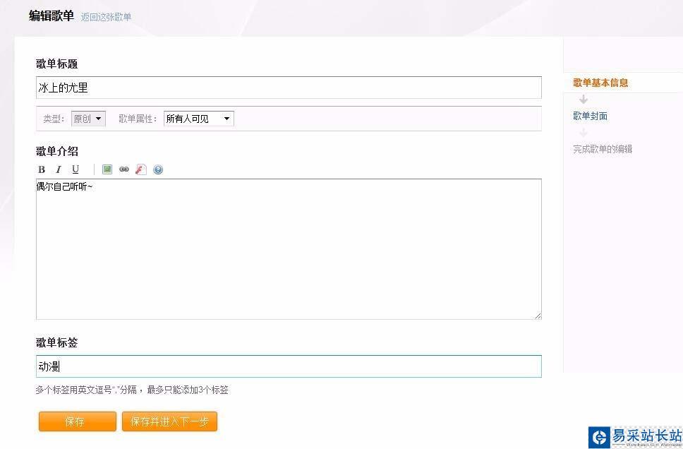 5、點擊編輯介紹和封面,可以進入到歌單的基本信息,填寫好后,點擊保存或者下一步,當然如果你創建的歌單不想別人看見或者搜索到,那就選擇歌單屬性【只有我自己看見】即可。