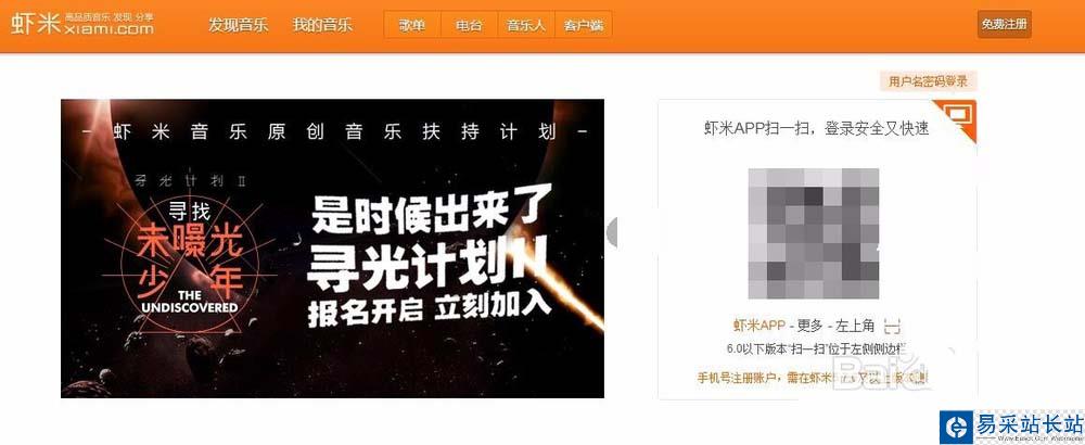 1、進入蝦米音樂的網頁版,在右側找到登錄的頁面,掃一掃或者是用戶名、密碼登錄都可以的,進入即可。