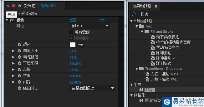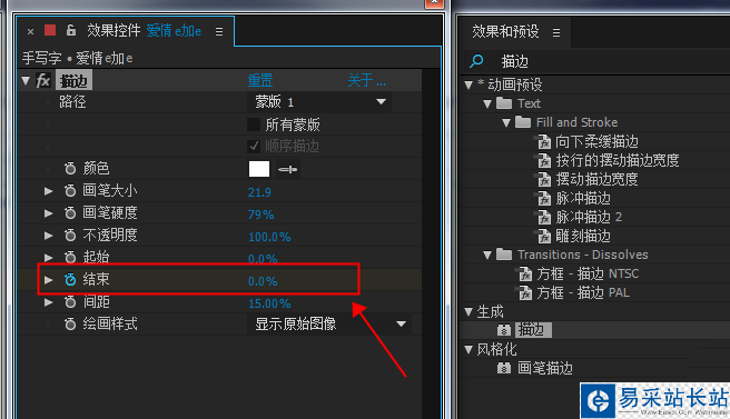5、在描邊結束處打上關鍵幀,并將開始值設置為零