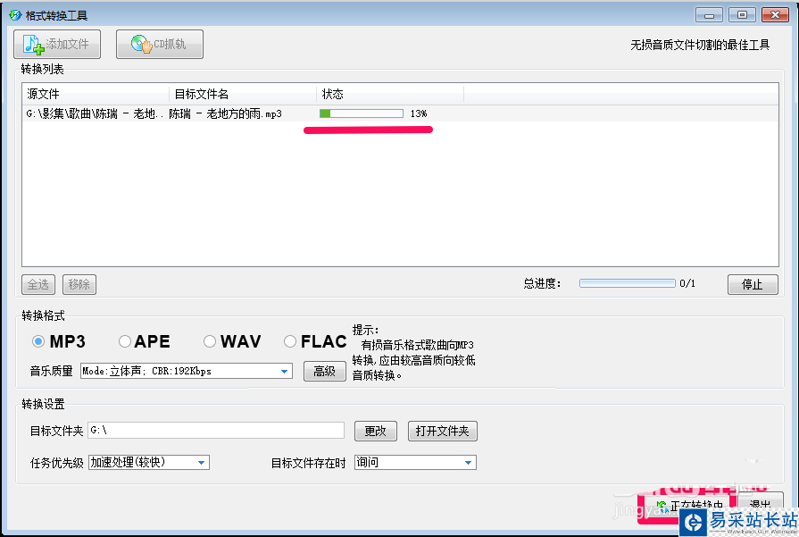 6、此時需要轉換的歌曲便顯示在格式轉換工具窗口的轉換列表中。點擊:轉換格式【MP3】,確定目標文件夾,【任務優先級】我們可以選擇:加速處理或資源優先,【目標文件存在時】可以選擇:重命名、詢問或覆蓋,最后點擊:轉換文件;