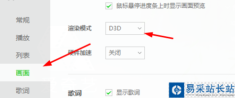 3、接著進入設置的界面,點擊左側的畫面,在右側可以看到渲染模式,在這里可以選擇默認的D3D,如圖所示
