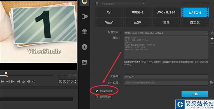 3、然后還是點擊【共享】,進行視頻格式、參數等的設置。然后注意的是在【只創建預覽范圍】前打鉤,然后點擊【開始】渲染,即可得到需要裁剪的視屏。