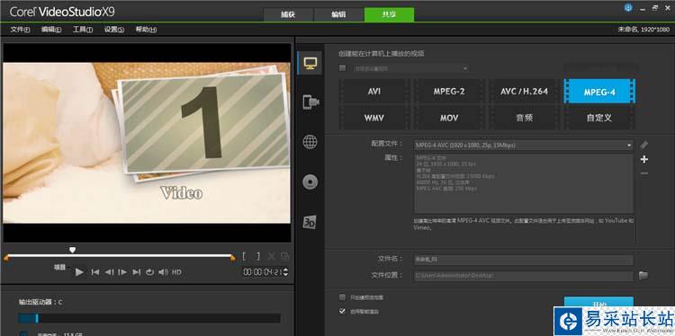 5、然后我們點擊【共享】,選擇生成文件的格式,及保存文件的位置。此外要想生成高清的文件可以點擊【配置文件】,選擇生成文件的大小及格式等,然后點擊【開始】,進行渲染即可。
