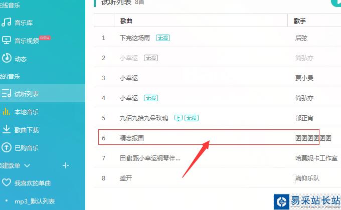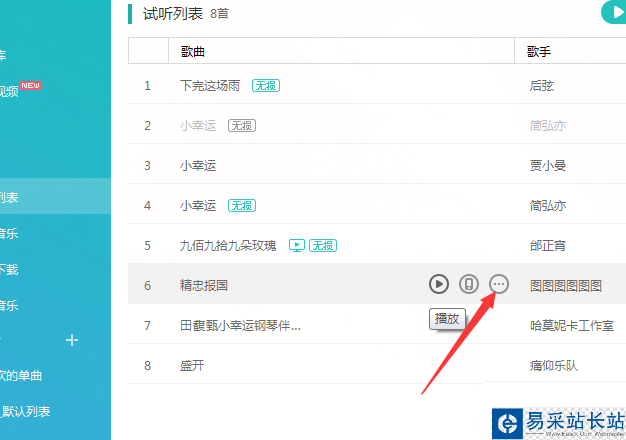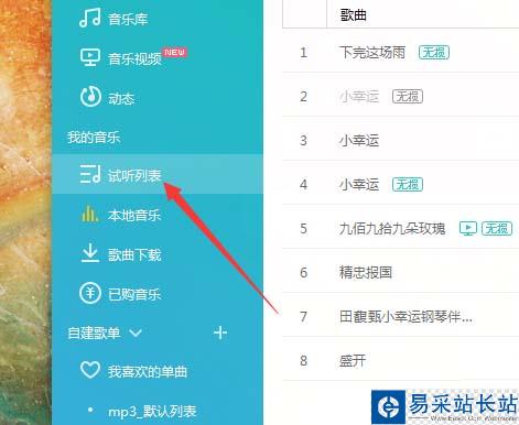 2、進入到了試聽列表中顯示所有的音樂,進行把鼠標移動一首歌曲上。