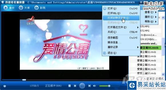 迅雷看看播放器新版本支持互聯網視頻播放功能,只要直接輸入其URL地址即可(如圖1)。同時,還可以直接打開視頻文件的種子,如果種子文件中包含有多個視頻文件,則會自動將其中的視頻添加到播放列表中,默認播放第一個視頻(如圖2)。