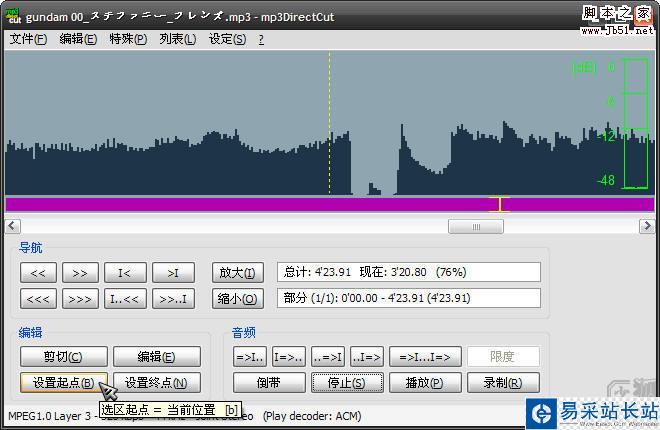 軟件主界面下半部分由導航區(定位切點)、音頻區(預聽歌曲)、編輯區(常用操作)等區域構成。其中導航區的使用相對復雜,而對于一般需求的手機鈴聲制作而言,導航區是使用頻度最低的區域,因此筆者并不推薦在此進行操作,而是演示一種避繁就簡的、“最速”的方式 – 點擊五、六次菜單或按鈕便完成手機鈴聲制作的流程。