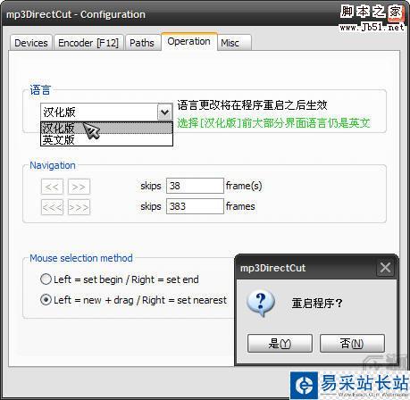 您可以選擇原始英文界面或者漢化的簡體中文界面,如果由默認的英文界面切換至簡體中文界面,程序將提示您重啟本軟件以使更改生效,此時請點擊[是]。