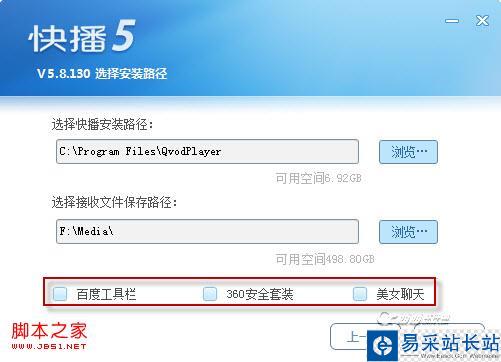 2、第二步就是選擇快播5.0的安裝路徑以及接受文件保存的文件夾地址了,西西小編在這里建議一下:最好將接收文件保存路徑選在空余磁盤空間較大的分區,更好的保存和管理下載的影視文件。注意下圖紅框中的三個選項,友友們根據自己的需要決定是否安裝哦。