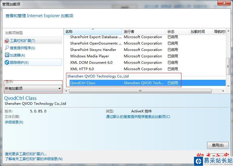 2.由于您的瀏覽器管理加載項中禁用了快播插件引起。解決辦法:打開IE瀏覽器,在菜單欄工具項→找到加載項管理器→“啟用”或“禁用”加載項,并在彈出的對話框中啟用所有以ShenZhen QVOD 開頭的加載項,