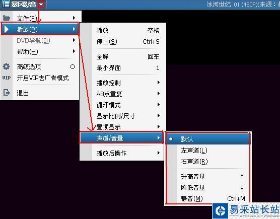 點擊主菜單下拉菜單中的播放——>聲道/音量——>選擇。