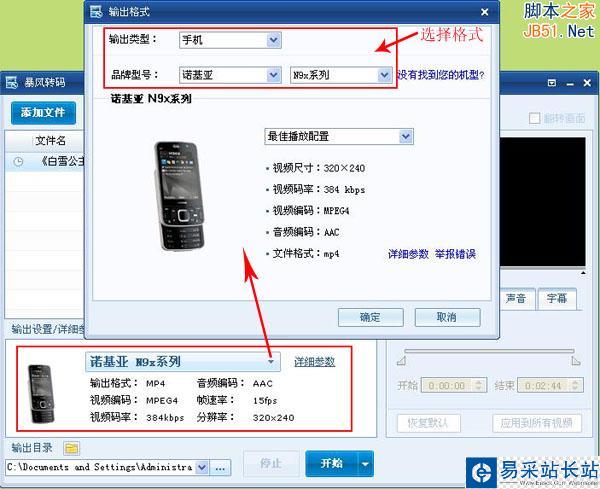 接下來我們就可以選擇輸出格式,先選擇“輸出類型”,再從輸出類型里面選擇具體的手機品牌,最后在品牌后面選擇對應的型號。
