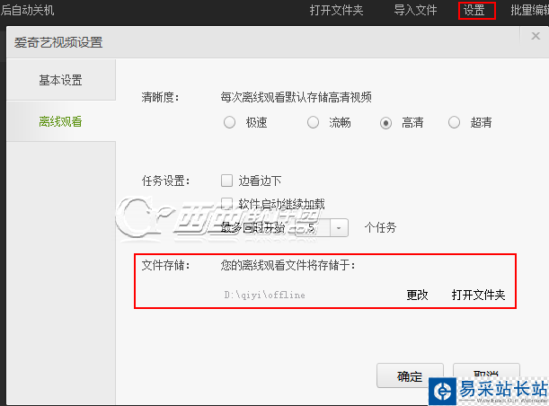 4、下載的視頻默認目錄是軟件安裝盤符的一個自創文件夾,這里可以自己設計,點擊上面列表中的設置然以后更改離線觀看文件儲存位置。