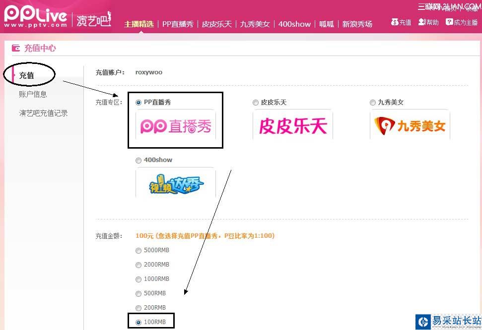 步驟1:從PPlive演藝吧首頁,一級導航欄【充值】進入;
