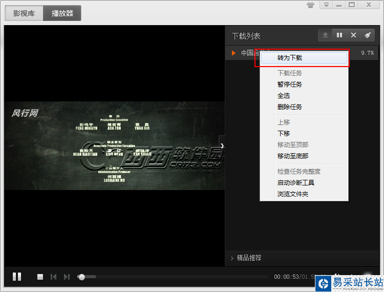 4、選擇一個資源點擊觀看,進入觀看界面后等待廣告播放完畢,然后右鍵播放列表的電影名選擇轉為下載該電影就進入下載狀態了。