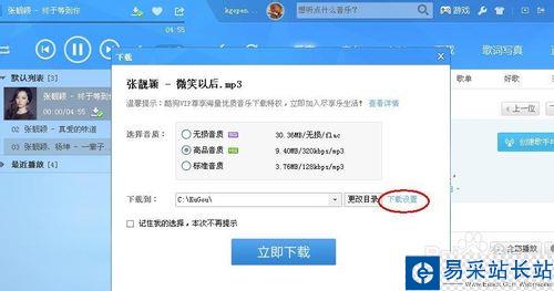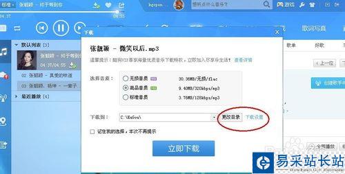 3、如圖所示在您找到歌曲后點擊下載即可,就會彈出下載設置窗口,您只要將下載目錄更改為自己的手機文件中,點“立即下載”即可成功下載歌曲到自己的手機中。